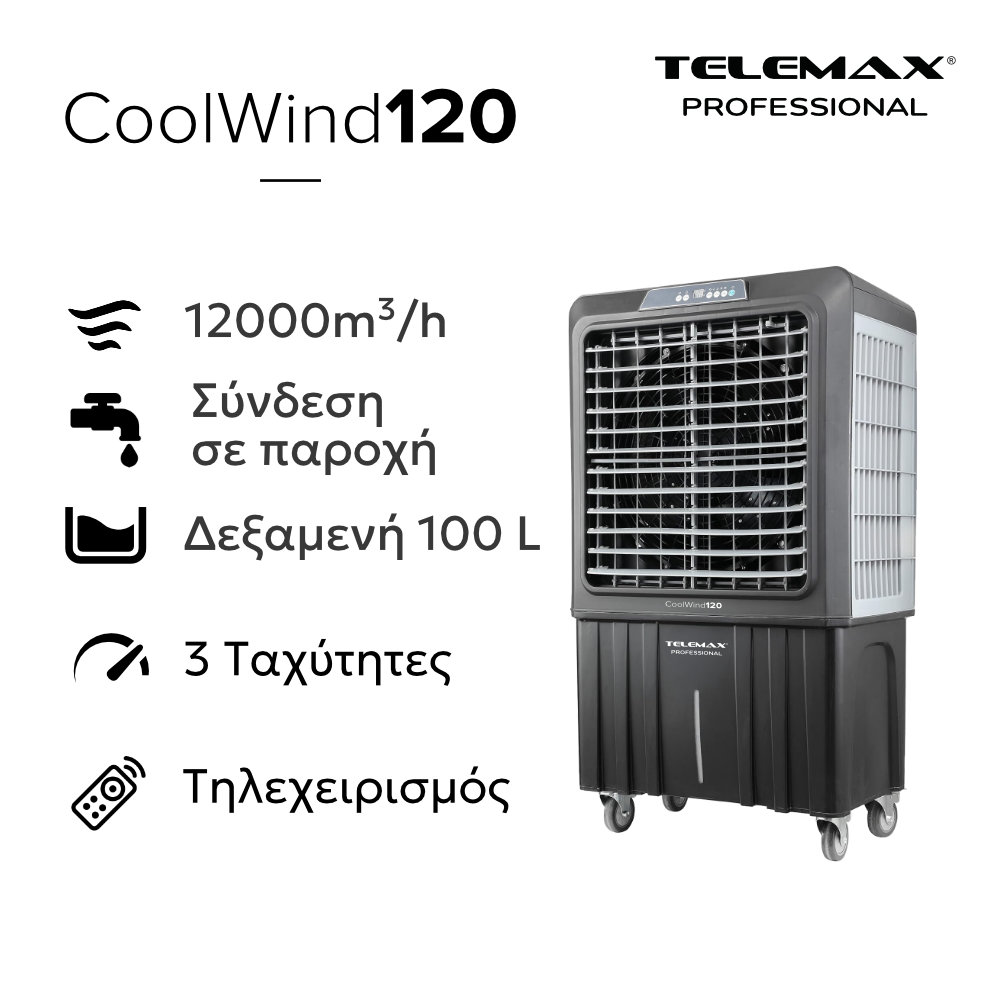 Το επαγγελματικό Αir cooler Telemax CoolWind120 (μοντέλο VAB12-EQ) αποτελεί την απόλυτη λύση για την αντιμετώπιση των υψηλών θερμοκρασιών σε μεγάλους επαγγελματικούς και οικιακούς χώρους. Αξιοποιώντας την προηγμένη τεχνοσία ψύξης με εξάτμιση νερού, προσφέρει ισχυρή δροσιά με απίστευτα χαμηλό κόστος λειτουργίας, χωρίς τη χρήση φρέον ή άλλων χημικών ουσιών.