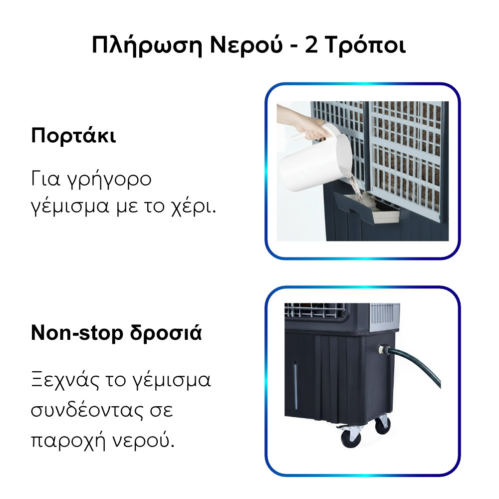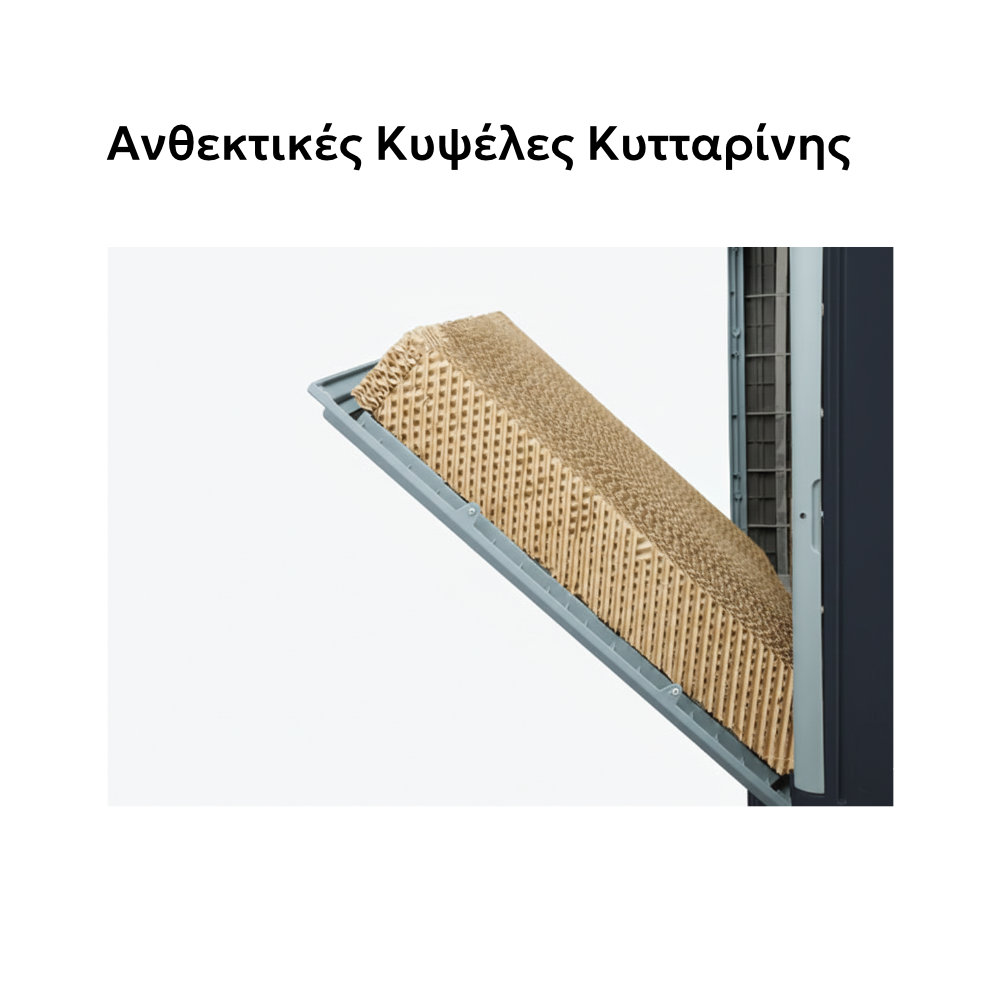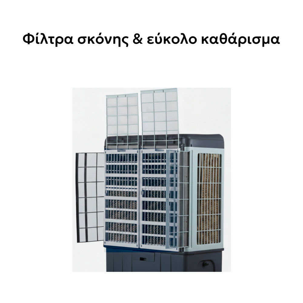 - Φυσική & Υγιεινή Δροσιά: Η τεχνολογία εξάτμισης εμπλουτίζει τον αέρα με υγρασία, χωρίς να τον ξηραίνει, ενώ τα ειδικά φίλτρα κυτταρίνης συγκρατούν τη σκόνη και τα μικροσωματίδια, προσφέροντας καθαρότερο αέρα.