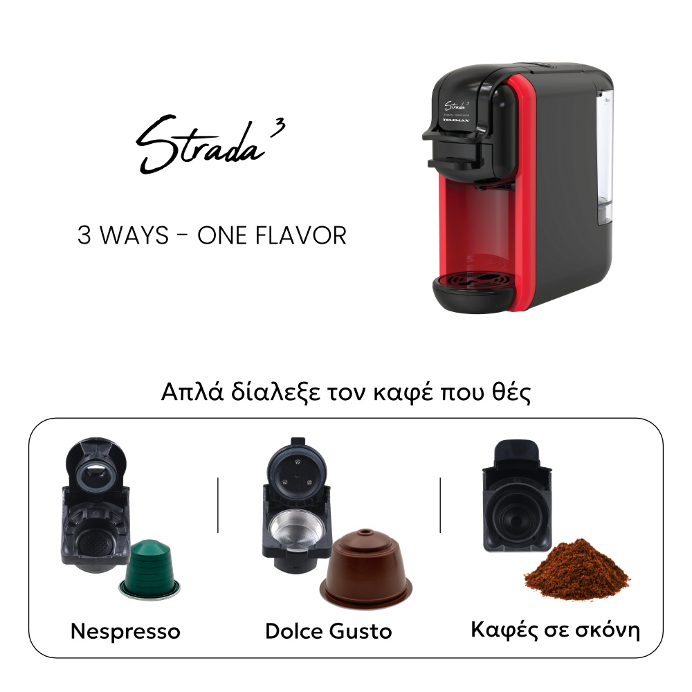 Η πολυμηχανή espresso Telemax Strada 3 σχεδιάστηκε για να καλύψει κάθε σας ανάγκη, συνδυάζοντας την ευκολία της κάψουλας με την αυθεντική γεύση του φρεσκοκομμένου καφέ. Χάρη στο σύστημα 3-σε-1, δεν χρειάζεται πλέον να επιλέξετε ανάμεσα σε διαφορετικές συσκευές.