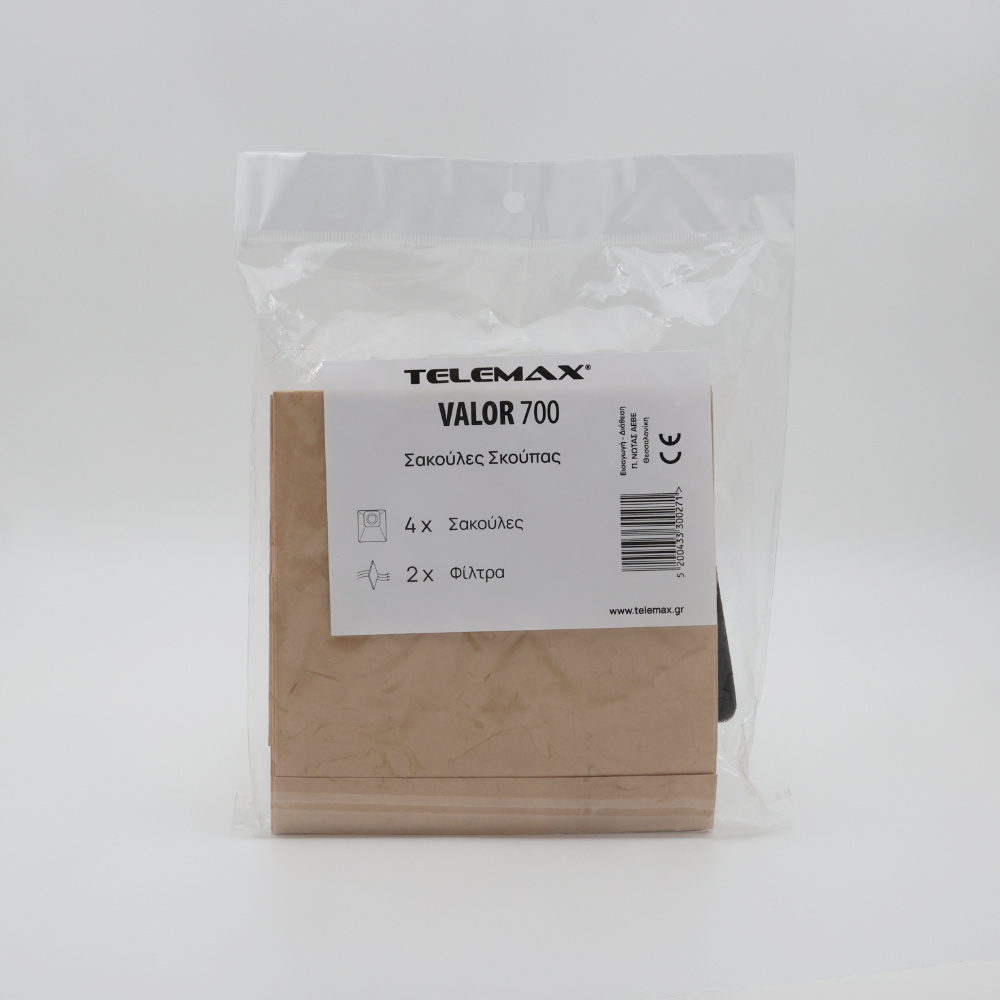 Σετ σακούλες και φίλτρα για σκούπα Telemax Valor 700, περιλαμβάνει 4 χάρτινες σακούλες και 2 φίλτρα, για βέλτιστη συλλογή σκόνης και καθαρότερο αέρα στον χώρο σας