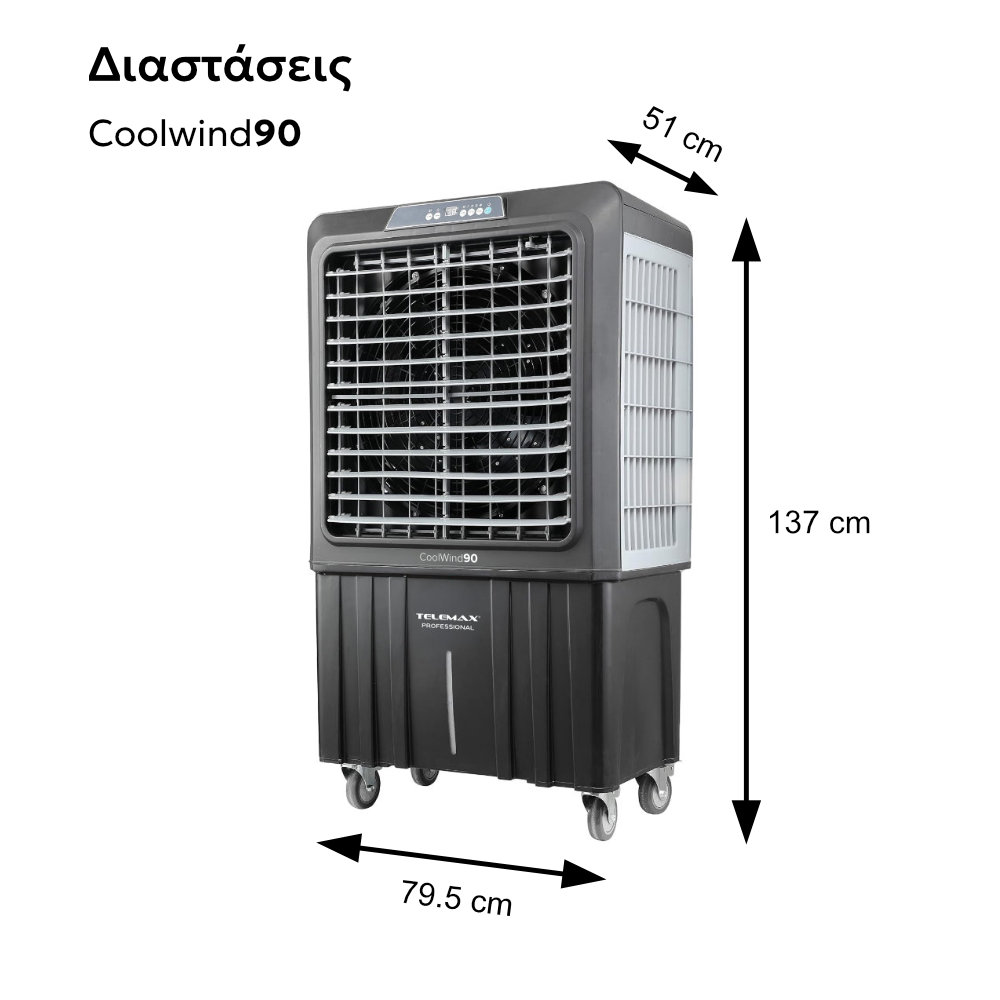 Το Air Cooler Telemax CoolWind90 είναι ένα προηγμένο σύστημα κλιματισμού με τεχνολογία εξάτμισης, που προσφέρει ισχυρή ψύξη 9.000 m³/h, εξαιρετικά χαμηλή κατανάλωση 350W και 80% εξοικονόμηση ενέργειας σε σχέση με τα παραδοσιακά συστήματα κλιματισμού. Είναι η ιδανική λύση για μεγάλους οικιακούς και επαγγελματικούς χώρους που απαιτούν οικονομική και υγιεινή δροσιά.